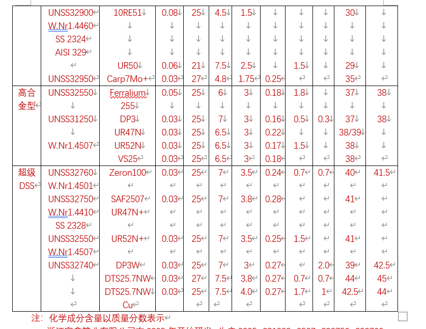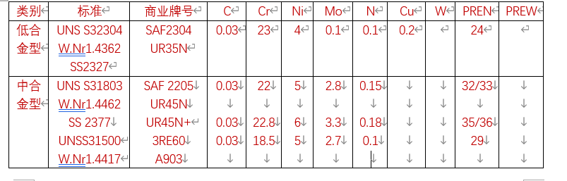 表1-1 雙相不銹鋼(DSS)代表牌號(hào)的主要化學(xué)成分(%)和孔蝕抗力當(dāng)量值
